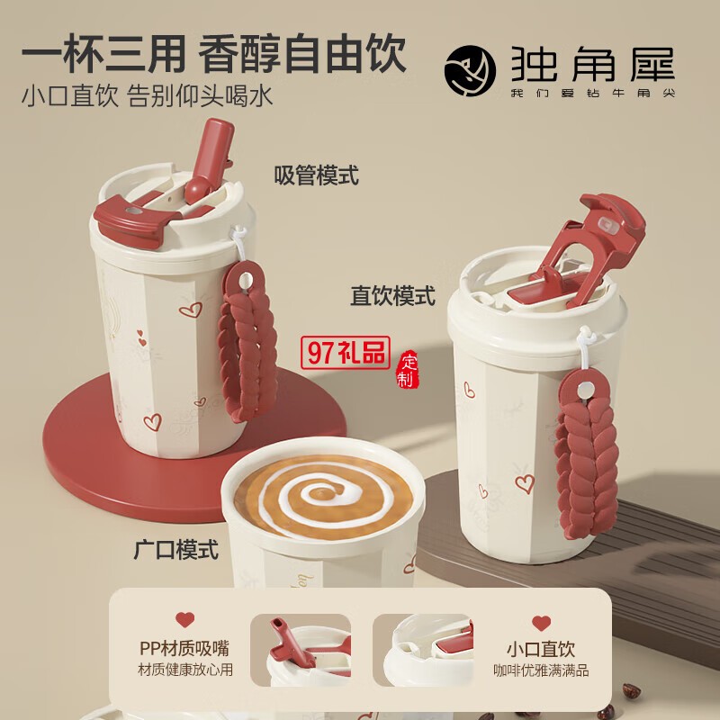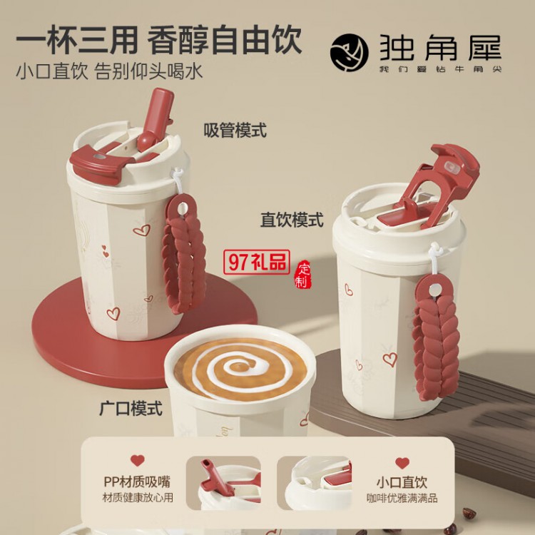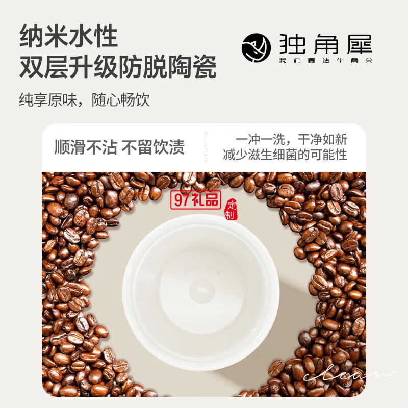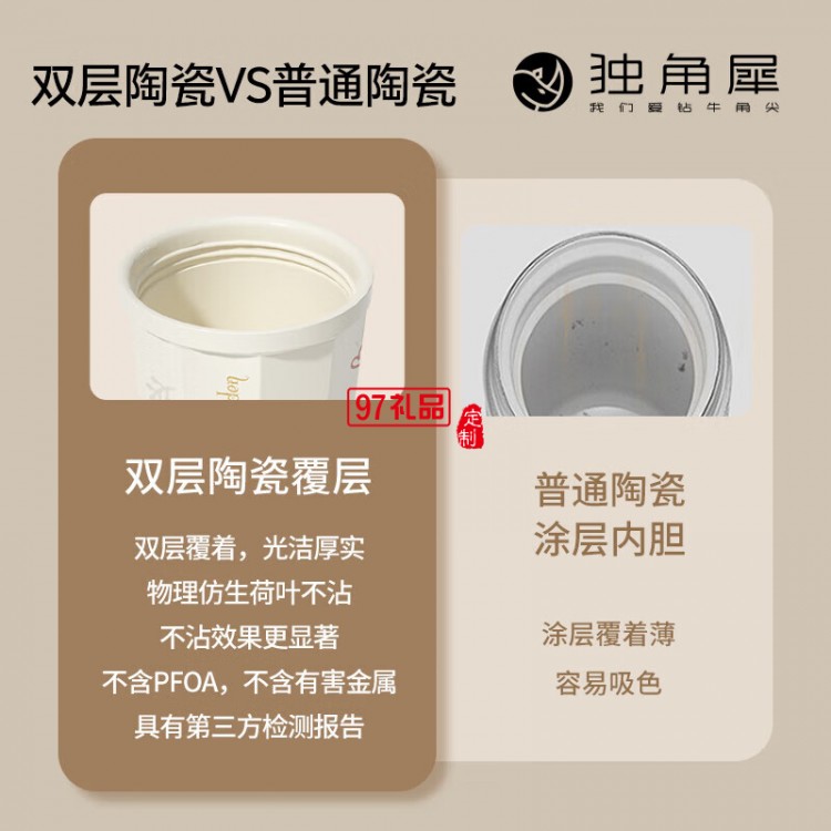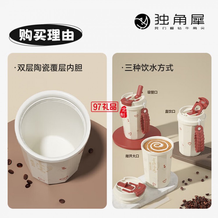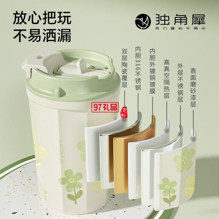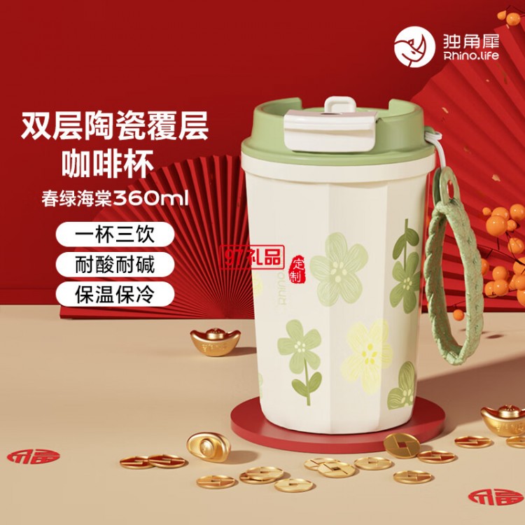 獨角犀春綠海棠雙飲口陶瓷內膽咖啡杯