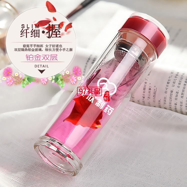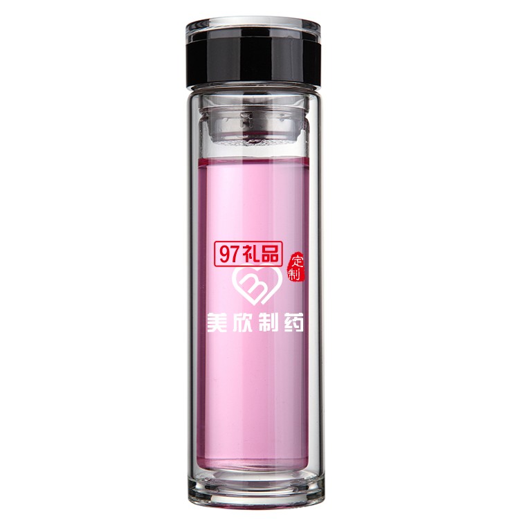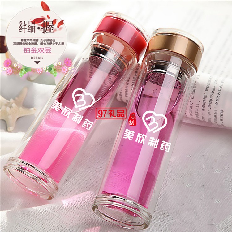 美欣制藥時(shí)尚雙層玻璃杯帶蓋濾網(wǎng)水杯高檔禮品杯 直筒爆款杯 可印logo