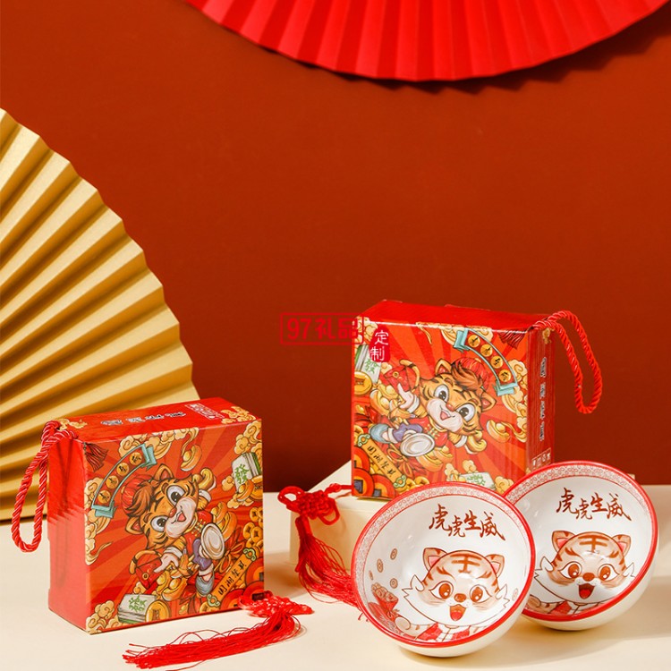 虎虎生威國(guó)潮陶瓷碗套裝活動(dòng)開業(yè)伴手禮虎年禮品碗陶瓷餐具禮盒裝