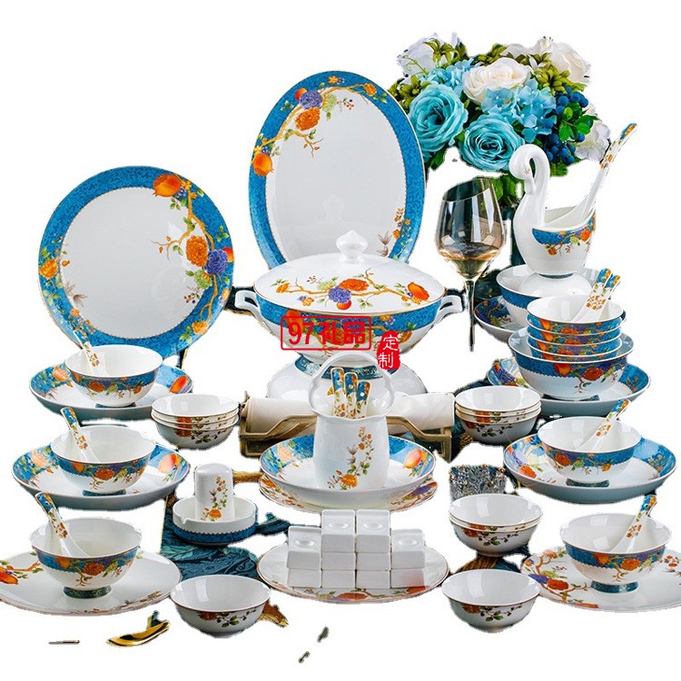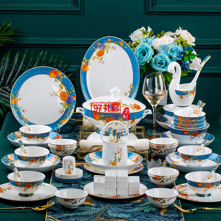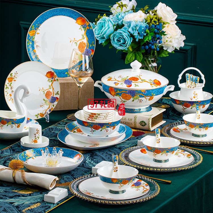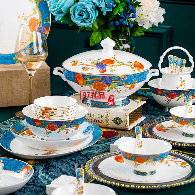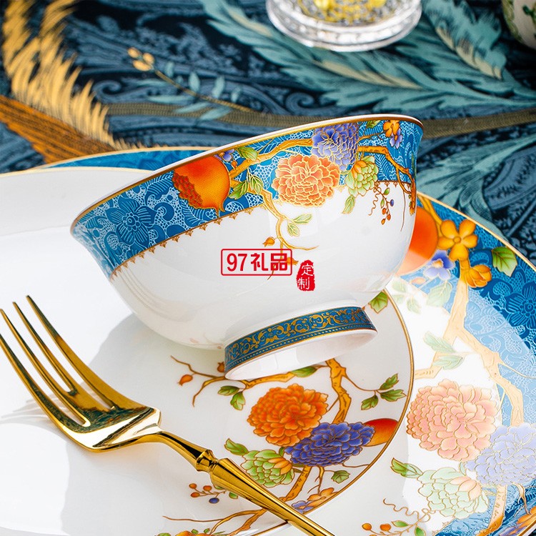景德鎮(zhèn)陶瓷餐具富貴石榴家用歐式金邊骨瓷碗碟套裝碗盤(pán)子