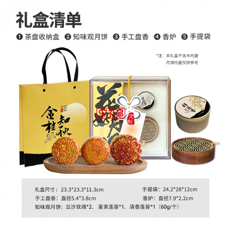 配置:茶盤收納盒*1、月餅*4、手工盤香*1、香爐*1、手提袋*1