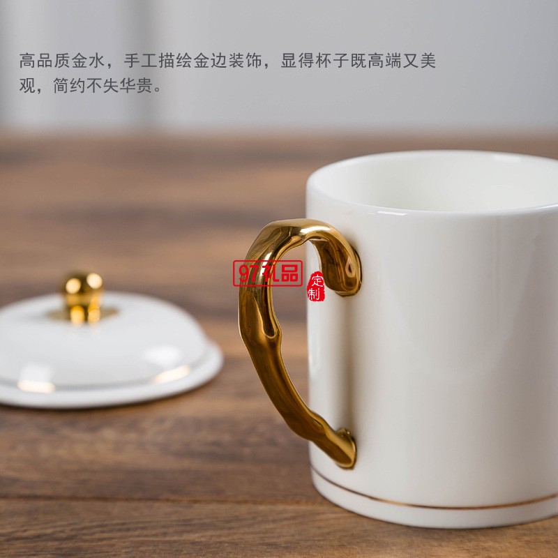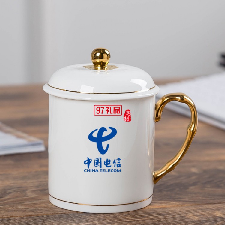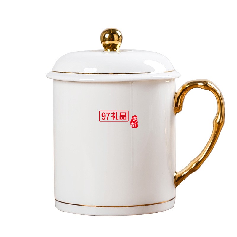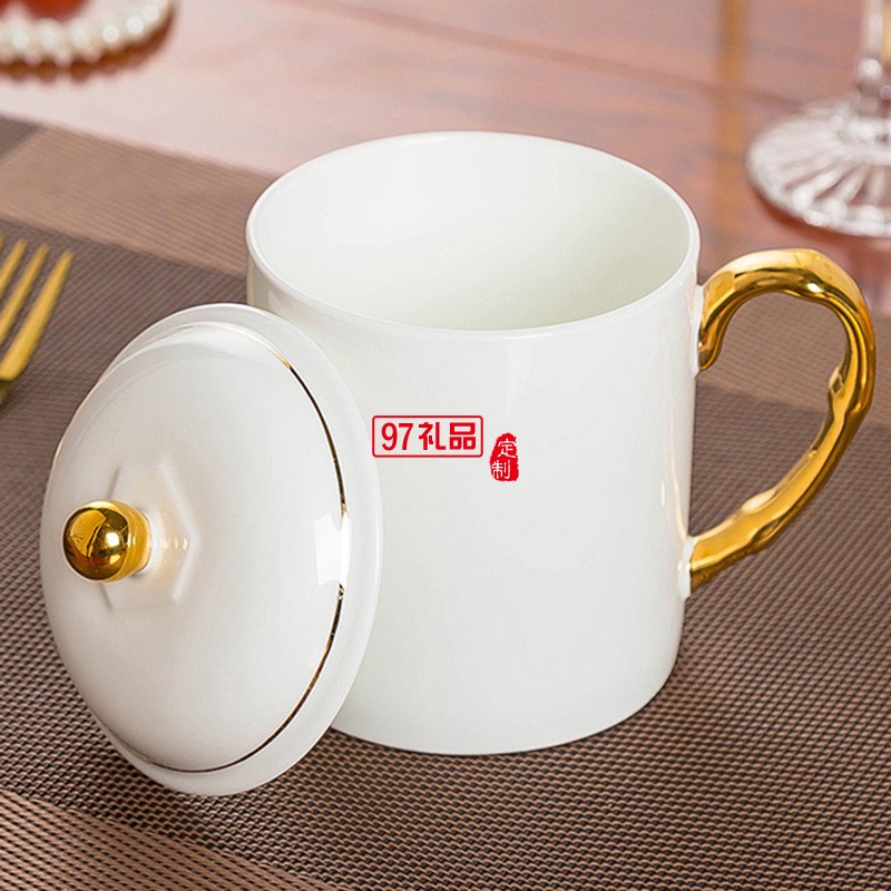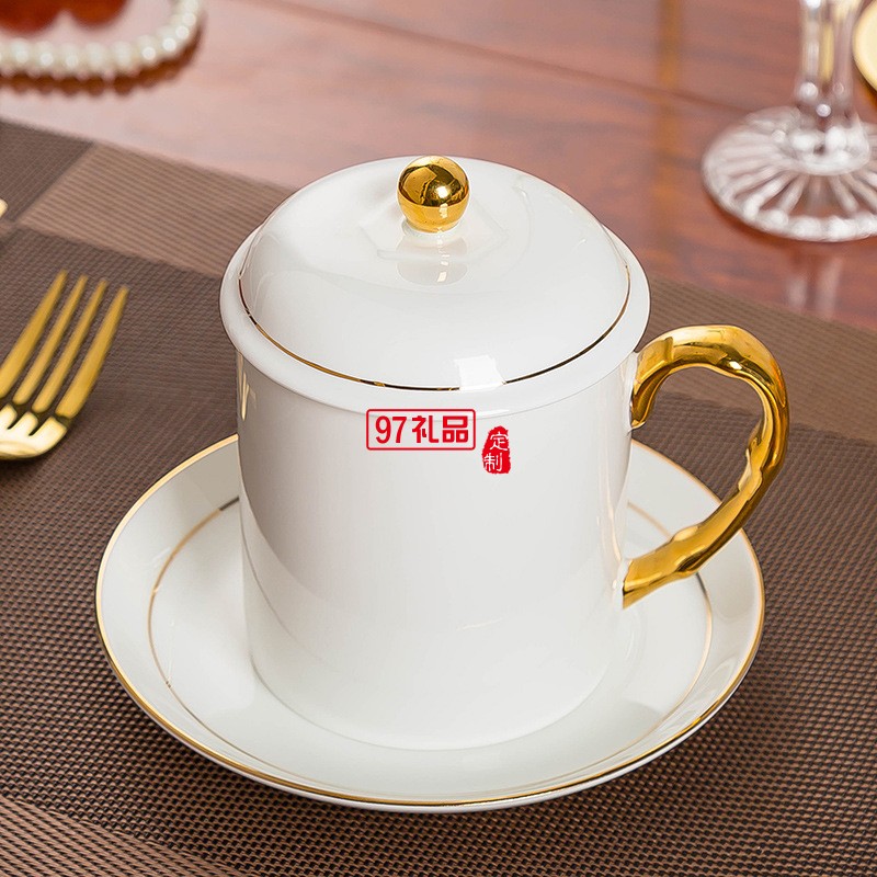 中秋國慶節(jié)禮品辦公會(huì)議杯帶蓋景德鎮(zhèn)陶瓷茶杯450ML明珠杯碟定制