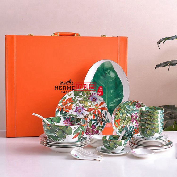 HERME愛(ài)馬歐式熱帶雨林系列36頭骨瓷餐具套裝禮盒描金中西式骨瓷