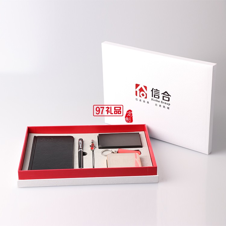 筆記本+筆+金屬書簽+移動電源+名片夾+工具鑰匙 信合商務定制案例