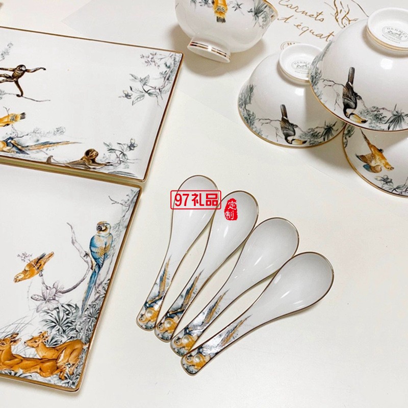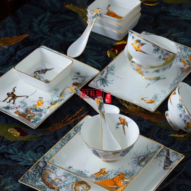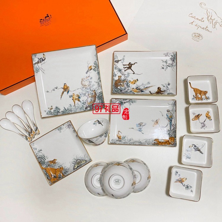 HERMES”愛(ài)馬16頭骨陶瓷鎏金餐具套裝赤道叢林系列方形盤(pán)碗碟勺禮