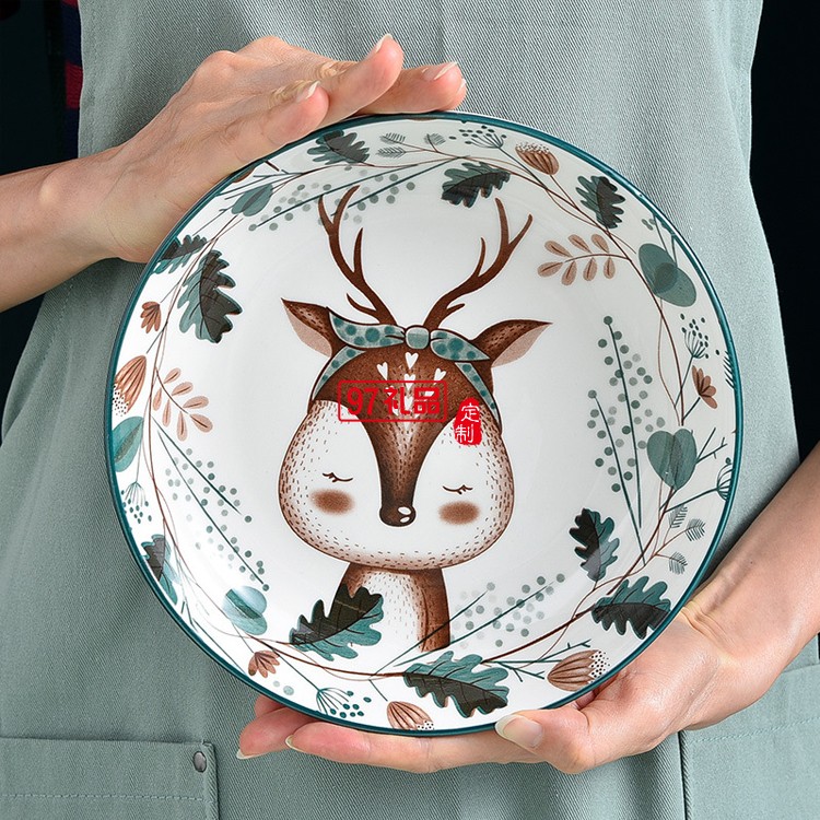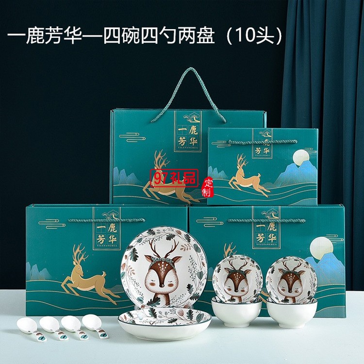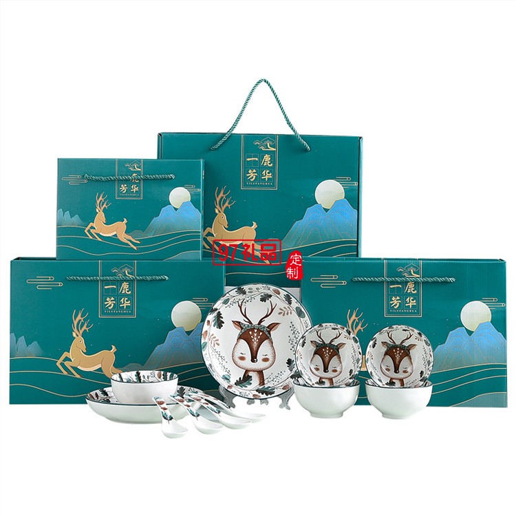 餐具碗勺套裝卡通陶瓷餐具家用碗碟盤套裝一鹿同行禮盒裝
