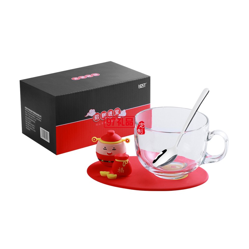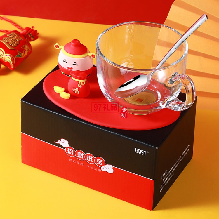 產(chǎn)品特點(diǎn): 杯子玻璃+PVC杯墊,攪拌勺不銹鋼材質(zhì)。獨(dú)特的財(cái)神爺和福袋設(shè)計(jì),寓意招財(cái)進(jìn)寶。原創(chuàng)設(shè)計(jì),圖案可定制。